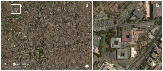 Figure 2a shows the satellite location of the study site within the broader urban context of Catania, while Figure 2b presents a simplified 2D view of the area, including the main buildings and circulation routes.