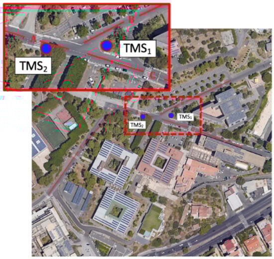 Two Traffic Monitoring Stations (TMS1 and TMS2) were set up at the main intersection of the campus in order to intercept all characteristic vehicular flows along road Sections A, B, and C, as shown in Figure 3. At each station, a Miovision Scout® (Miovision Technologies Incorporated, Kitchener, Ontario, Canada) device was installed—an autonomous, video-based monitoring system equipped with high-efficiency sensors and LTE connectivity. The two units, owned by the Department of Civil Engineering and Architecture at the University of Catania, enable the accurate detection of directional traffic flow and vehicle classification, distinguishing between private cars, motorcycles, buses, and vans.