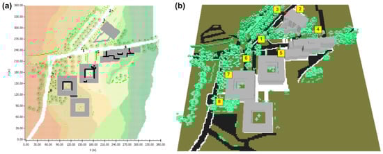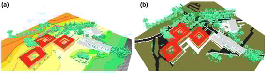 To accurately reproduce the topography, Digital Elevation Models (DEMs) were incorporated into the model setup. This allowed the terrain’s natural slope and local altitude variations to influence airflow and surface temperature distribution, improving the physical reliability of the microclimate simulations. Figure 4 displays the modeled domain under the baseline scenario, both with (Figure 4a) and without (Figure 4b) the DEM.