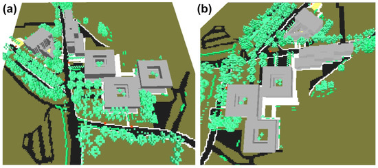 (a,b) Two different 3D perspectives of Scenario n. 1 simulated with ENVI-met.