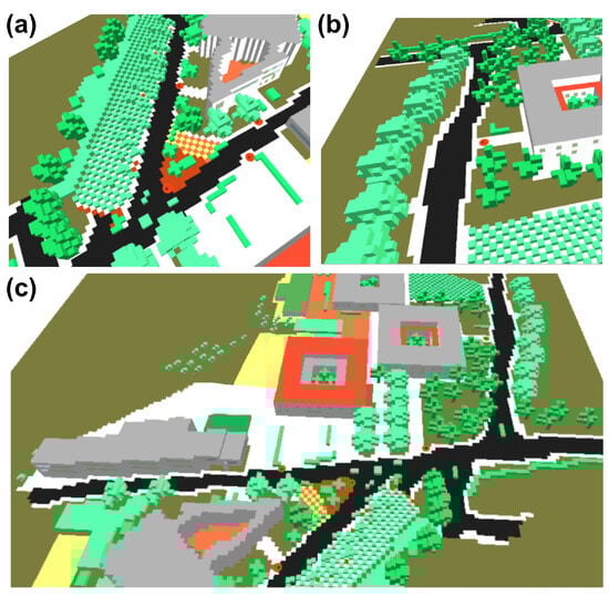 Detailed 3D views of Scenario 2 simulated with ENVI-met: (a) draining pavement in a redesigned parking area; (b) tree rows along a main road; (c) upgraded pedestrian paths with photocatalytic paving.