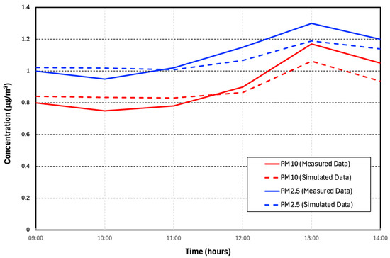 To ensure the reliability of the simulation outputs generated by the ENVI-met model, a validation procedure was carried out by comparing simulated values of air pollutants (PM10 and PM2.5) and microclimatic parameters with experimental measurements collected on-site during the monitoring campaign. This step was essential to verify the model’s performance and support the credibility of subsequent impact assessments.