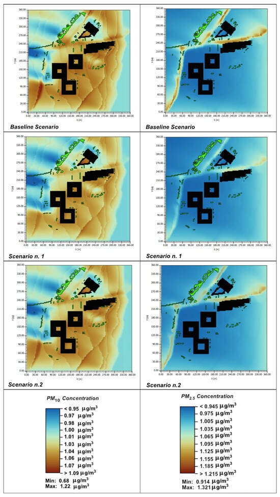 To evaluate the effectiveness of the proposed mitigation strategies, a comparative analysis was conducted between the baseline condition and the two alternative scenarios described in Section 2.4. This assessment focused on quantifying variations in both air quality and outdoor thermal comfort parameters, using spatially explicit indicators derived from ENVI-met simulations.