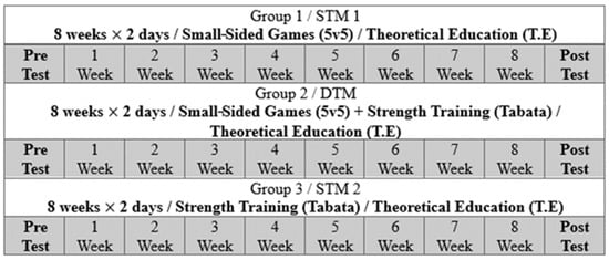 A total of three groups of football players were included in the study. Group 1 (STM 1) consisted of 19 football players with an average age of 27.84 ± 5.65, and only small-sided games were added to their existing training programs. Group 2 (DTM) included 20 football players with an average age of 25.80 ± 4.10, who participated in a combined training model consisting of small-sided games and strength training, in addition to their existing training programs. Group 3 (STM 2) comprised 21 football players with an average age of 20.90 ± 1.58, and only strength training was applied in addition to their regular training programs.