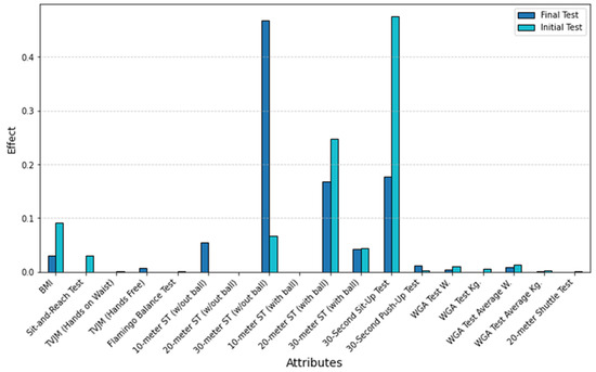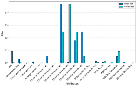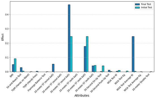 For STM2, substantial changes were also noted. The sit-and-reach test, 10 m sprint (without a ball), and 30 m sprint (with a ball) gained importance after training. Meanwhile, the importance of the 10 m sprint (with a ball) and 20 m sprint (with a ball) declined, reflecting reduced relevance of ball-control sprints in the STM2 group post-intervention. These patterns are visualized in Figure 4.