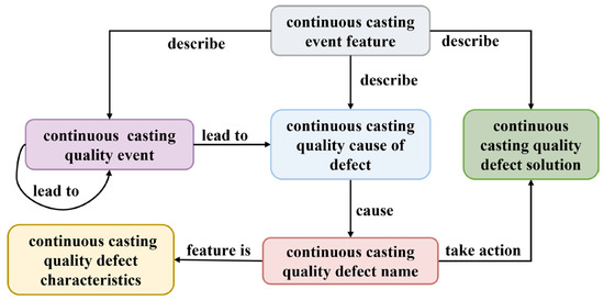 Specifically, the ontology model consists of six entity elements: continuous casting defect name, continuous casting event, continuous casting cause of the defect, continuous casting defect characteristics, continuous casting defect solution, and continuous casting event feature. These elements are interconnected by five relationships: lead to, cause, describe, taken action, and feature is.