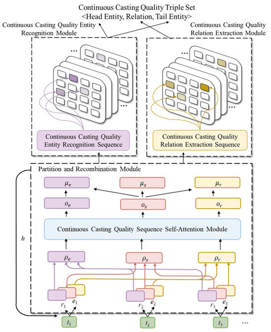 As shown in Equation (1), and are the results partitioned by entity gate and relation gate , is the current continuous casting quality token, h is the hidden layer’s output from last epoch, and is defined by Equation (2).