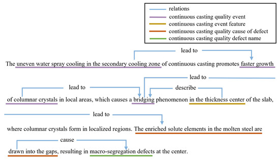 Compared to daily texts, quality engineering texts in continuous casting domain have the following characteristics. Firstly, these texts are highly specialized, containing a large number of proprietary terms and technical jargon in continuous casting domain, such as crystallizer, secondary cooling zone, surface cracks on square billets, equiaxed grains, etc. Those KGs applicable to general domain cannot cover the quality engineering texts related to continuous casting. Secondly, the proportion of entities and relationships in the corpus is significant. In the general domain, a sentence may only contain one triple, while in the continuous casting domain, each sentence may contain multiple triples that need to be extracted.