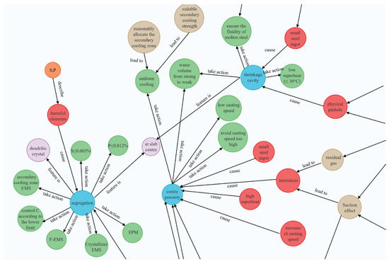 As shown in Figure 7, we leverage the Neo4j database for persistent storage and visualization of the DSKG for quality engineering of continuous casting. The specific node and relationship data are shown in Table 2. In short, the process we propose successfully constructed a DSKG for quality engineering of continuous casting from continuous casting quality text and achieved persistent storage for future application.