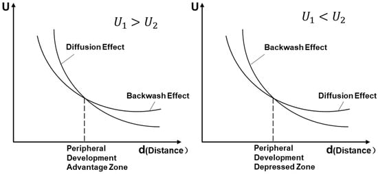 A key theoretical framework underpinning the development of urban interstitials is the research of Gunnar Myrdal (1957), who is associated with classical regional economic theory; specifically, his concepts of “diffusion” and “backwash” effects are of particular relevance []. The research of the Myrdal model describes how urban centers exert both positive externalities (diffusion effects) and negative forces (backwash effects) on the surrounding peripheral areas. Diffusion effects refer to the outward flow of benefits and development from urban cores, while backwash effects describe the inward pull of resources, labor, and capital toward these centers. The balance between these effects helps explain the uneven development of interstitial areas, where peripheral spaces experience either intensified development or underdevelopment depending on the relative strength of diffusion and backwash effects. This framework provides valuable insights into how urban interstices evolve (Figure 1), as they often experience both types of effects simultaneously—being shaped by the external influence of core cities while still maintaining distinct spatial and administrative characteristics [,].