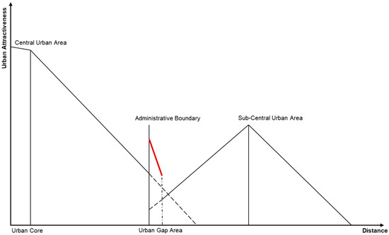 Existing research on urban interstices has primarily employed qualitative methodologies or focused on case studies in Western metropolitan contexts. In these settings, interstitial spaces often emerge from market-driven suburban expansion, producing low-density, fragmented landscapes marked by regulatory discontinuities and infrastructural mismatch. Such areas frequently manifest as brownfields, fringe belts, or underutilized buffer zones—embedded in wider patterns of zoning, speculative development, and socio-spatial inequality [,,,,,,,,,,]. However, the experience of urban interstices in rapidly urbanizing countries, notably China, differs considerably due to distinct administrative structures and state-led regional planning frameworks [,]. In China, administrative boundaries significantly impact urbanization trajectories, creating distinct dynamics compared to market-oriented urban growth common in Western contexts []. Chinese urban interstices are typically shaped by a combination of state intervention, administrative jurisdictions, and economic spillovers from adjacent metropolitan cores. Despite this, few studies have quantitatively explored how such administrative fragmentation interacts with functional urban integration, resulting in distinctive spatial development patterns.