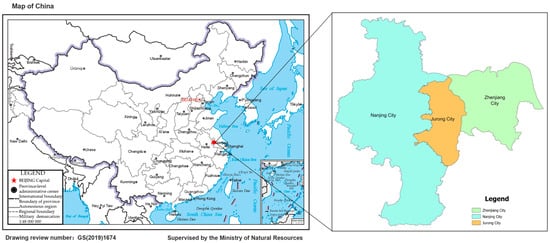 Jurong City (118°57′~119°22′ E, 31°56′~32°13′ N), located in central Jiangsu Province along the southern bank of the Yangtze River, serves as the paradigmatic case for this research. Geographically positioned between the regional cores of Nanjing and Zhenjiang (Figure 4), Jurong exemplifies a typical interstitial urban area within the polycentric urbanization framework of the Yangtze River Delta. Administratively subordinate to Zhenjiang, Jurong has strategically aligned its development trajectory toward Nanjing through the “Integration into Nanjing, Coordination with Zhenjiang” regional policy, reflecting both the city of Nanjing’s expanding metropolitan influence and local political–economic ambitions driven by the political achievement tournaments in China [,]. Its strategic location presents a distinctive interstitial spatial configuration, characterized by three key functional roles in Jurong:
