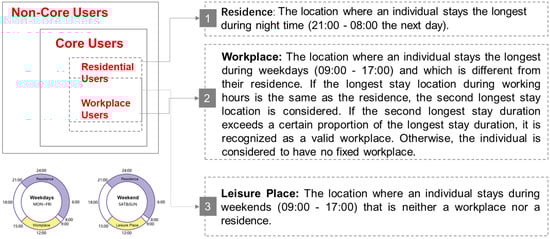 - Derivation of home, work, and other destinations: Subsequently, we derived primary home locations, workplaces, and other significant activity locations for each core user. Home locations were determined by identifying the grid cell with the highest cumulative dwell time during nighttime hours (21:00–08:00). Workplace locations were similarly determined by locating the grid cell exhibiting the longest cumulative daytime dwell time during weekdays (09:00–17:00), excluding home locations. If daytime and nighttime locations coincided—indicative of individuals working from home or those without distinct external workplaces—the second-most frequent daytime location was evaluated. If this secondary location represented a substantial proportion of daytime presence (set by a predefined time threshold), it was designated as the workplace. In cases where no suitable secondary daytime location existed, users were categorized as having no distinct workplace, reflecting patterns characteristic of retirees or home-based occupations. Additionally, other significant activity locations such as shopping areas, educational facilities, or recreational venues were identified using a dwell-time threshold criterion (continuous presence exceeding one hour). By sequencing these locations chronologically, complete daily mobility chains for each user (e.g., Home → Destination 1 → Destination 2 → Home) were constructed, facilitating comprehensive OD trip identification.