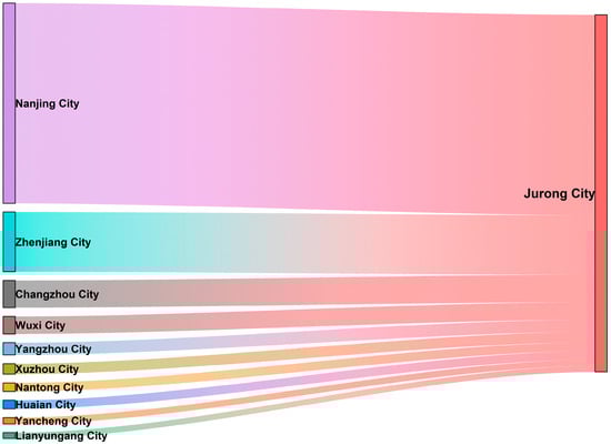 This concentrated mobility pattern indicates that Jurong primarily functions as a recipient and redistribution node for metropolitan spillovers from Nanjing, significantly more so than from its administrative parent, Zhenjiang. Consequently, Jurong has a clear functional dependence on Nanjing, reflecting substantial metropolitan integration despite administrative fragmentation (Figure 7).