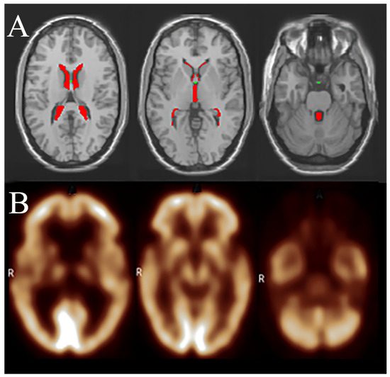 An exemplificative representation of the methodological approach used in this study for defining regions of interest (ROIs) using the WFU PickAtlas tool implemented in SPM12. Upper row (A): anatomical MRI images displaying ventricular ROIs (highlighted in red). These ventricular ROIs, derived through the WFU PickAtlas, were subsequently applied to PET scans of the patients included in the analysis. Lower row (B): corresponding 18F-FDG PET images, onto which the ventricular ROIs were mapped to measure 18F-FDG in CSF. The 18F-FDG values were normalized to pons activity to correct for individual metabolic variability, thus enabling the assessment of cerebrospinal fluid glucose dynamics in relation to Alzheimer’s disease pathophysiology. The ventricles in PET images may appear larger than those in MRI due to the lower 18F-FDG uptake in surrounding white matter. This image is intended purely to clarify the methodological approach and does not represent the exact methodological procedure used in this study (see text for detailed information). R: right side.