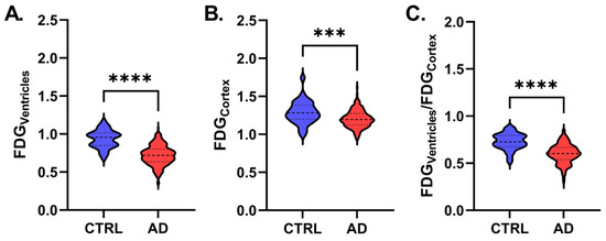 Violin plots depicting differences in FDGCortex (A), FDGVentricles (B), and FDGVentricles/FDGCortex (C) in the CTRL (blue) and AD (red) groups. *** means a p-value < 0.01, **** means a p-value < 0.001. The thick dotted line within each violin represents the median, while the thinner dotted lines indicate the first and third quartiles.