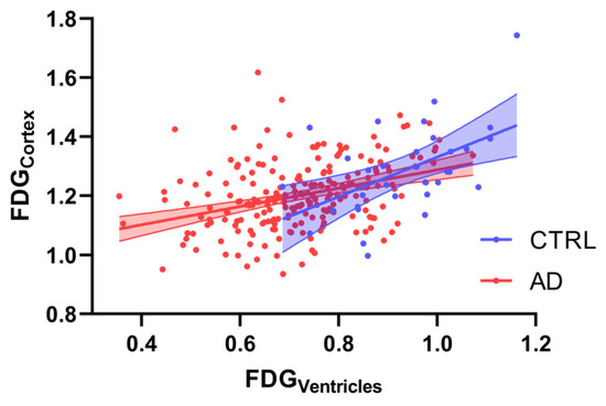 Scatter plots depicting the correlation between FDGCortex and FDGVentricles in the CTRL (blue dots) and AD (red dots) groups. Colored areas represent 95% confidence intervals.