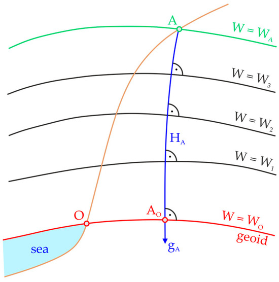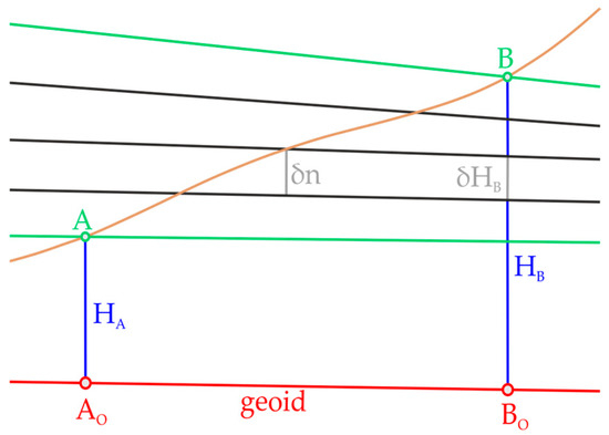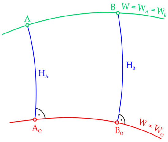 In Figure 3, points and lie on the same level surface, which implies that they have the same geopotential numbers and, consequently, the same dynamic heights, even though due to the non-parallelism of the level surfaces, they are not equally distant from the geoid.