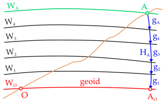where the integral is independent of the integration path, so different leveling lines from to should give the same result. Point is located at sea level (on the geoid) and an arbitrary point on some different level surface is connected to point by geometric leveling in the real gravitational field (Figure 2).
