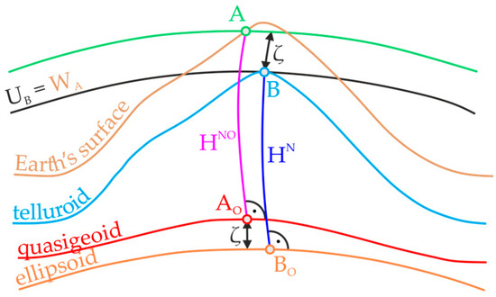 This point has a certain potential and a normal potential , where WA ≠ UA. If a point is now defined on the plumbline of point such that WA = UB, meaning the normal potential at point equals the real potential at point , then the normal height of point can be defined as the geometric distance of point from the ellipsoid [4]. The surface on which point is located is called a telluroid and represents an approximation of the Earth’s surface. It is defined as a surface whose height above the ellipsoid corresponds to the height of the Earth’s physical surface above the quasigeoid. The reason for introducing the quasigeoid is that the distance from the ellipsoid to the quasigeoid, known as the height anomaly , can theoretically be calculated exactly, unlike the geoid, where this is not the case [8].