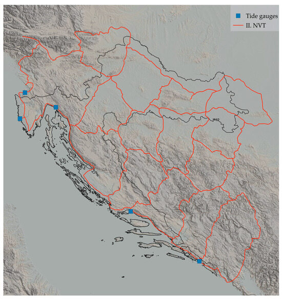 The Republic of Croatia officially uses the normal–orthometric height system as its national vertical reference. On 4 August 2004, the Government of the Republic of Croatia brought the Decree on establishing new official geodetic data and map projections of the Republic of Croatia [12]. According to the Decree, Croatia adopted a new vertical reference system called HVRS71. HVRS71 was realized with the Second High Accuracy Leveling (cro. II. Nivelman visoke točnosti—IINVT) network of benchmarks with normal–orthometric heights. IINVT was stretched over the territory of former Yugoslavia (Figure 7). Mean sea level was determined by measurements at five tide gauges on the eastern shore of the Adriatic Sea: Koper (Slovenia), Rovinj, Bakar, Split, and Dubrovnik for a period of 18.6 years (Figure 7). More about HVRS71 can be found in Klak et al. [13], Rožić [14], Rožić and Razumović [15], and Pavasović et al. [16].