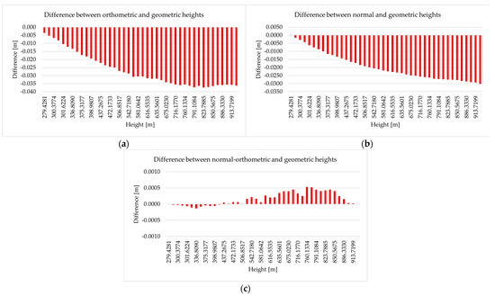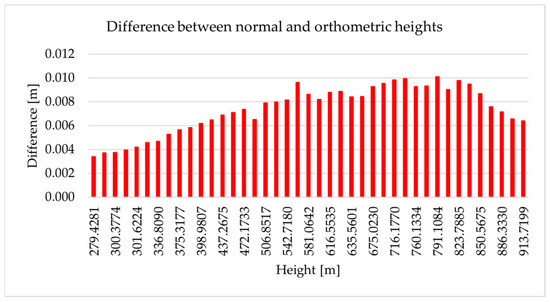 where , in seconds, and in meters. The obtained normal–orthometric correction is in millimeters. The normal–orthometric height difference is obtained using the following equation [10]: