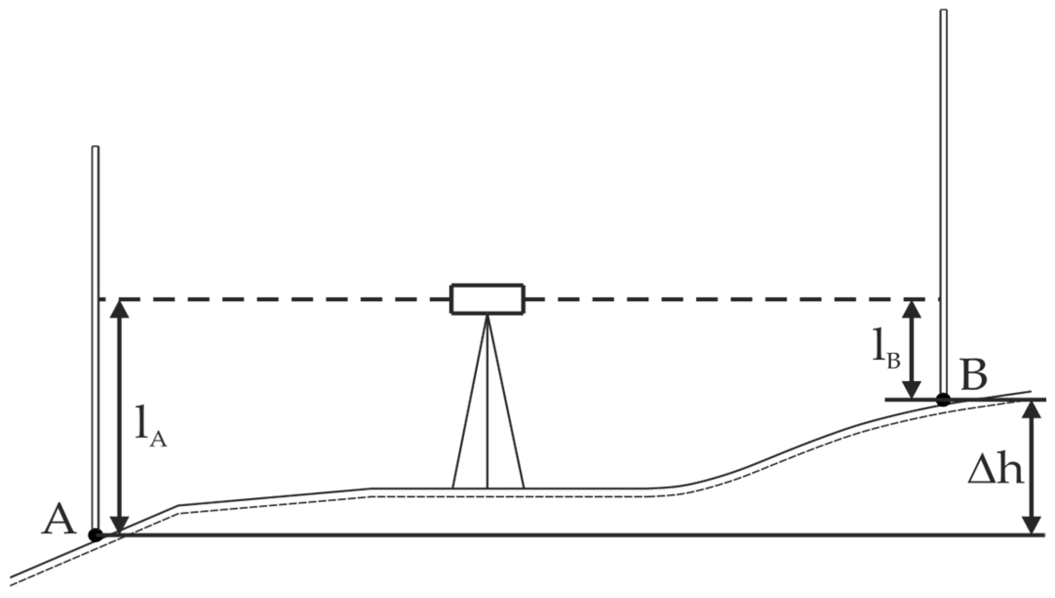 Geometric leveling is a method for determining height differences between points, such as and , with the leveling instrument and leveling staffs. By using horizontal sight, the leveling instrument, placed between two staffs, reads the sections on the two leveling staffs at points and , thereby determining the height difference between these points (Figure 9) [22].