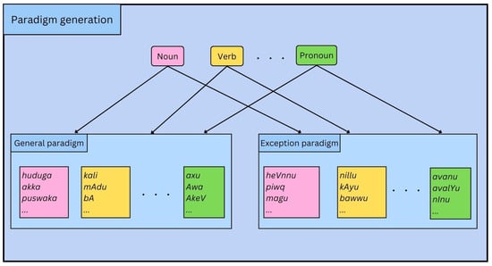 Considering the above-mentioned challenges, a Kannada morphological analyzer can be approached in two ways: the first is a rule-based approach, which utilizes a dictionary and applies predefined morphological rules to the words in the dictionary. This approach involves manually defining the rules, which are subsequently integrated into the system. The second approach is corpus-based, where a corpus is created, and machine learning algorithms are applied to generate the morphological analysis [15]. A paradigm refers to a set of rules that can be recognized in the process of word formation [16]. A morphological analyzer can be built by creating paradigms for various word categories in a dictionary.