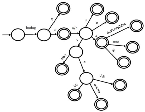 The following POS tags are considered in this study: noun, verb, indeclinable, adjective, numeric and pronoun. A Finite State automaton (FSA) is an abstract machine that can be in one of a finite number of states at a given point in time [35]. The adjectives, numerics, and indeclinables are retained as they do not have any inflections. The FSA for inflections of the noun huduga is shown in Figure 5.