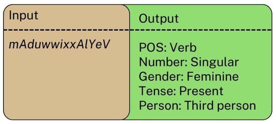 A sample input and output for the verb mAduwwixxAlYeV is given in Figure 6. The features identified for the input word mAduwwixxAlYeV are POS, number, gender tense, and person. These features vary depending on the inflection that is being analyzed.