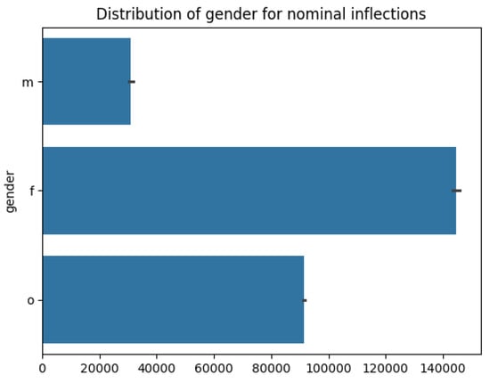 The genders considered are masculine (m), feminine (f), and neuter (o). It can be observed that the nominal data have more words that belong to the feminine category than the neuter, and the masculine category has the least number of words.