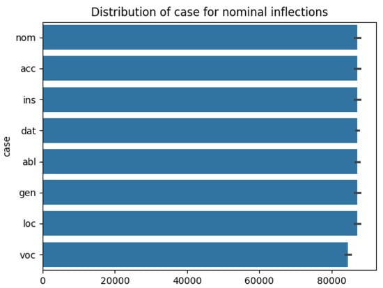 There are mainly eight cases in Kannada that the inflections can be categorized to, which include nominative (nom), accusative (acc), instrumental (ins), dative (dat), ablative (abl), genitive (gen), locative (loc) and an optional vocative (voc) case. It can be observed that all cases except vocative have equal distribution, indicating a lower number of vocative inflections.