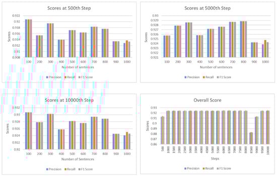 Using the Transformer architecture, the generated morphological analysis was evaluated for 1000 inflected nouns, and the results are shown in Table 14. The test set was independent of the inflectional words present in the training or validation set. Hence, the test was performed on new data that the model had not seen. The Precision, Recall, and F1 scores for steps 500, 5000 and 10,000 were calculated by varying the number of sentences, as shown in Table 15. The graphical representation of the overall scores is shown in Figure 11.