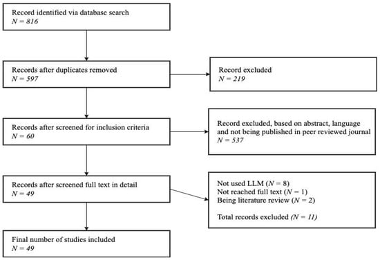 The flow diagram illustrating the screening process is presented in Figure 1. According to Figure 1, 219 of the 816 studies were found to be duplicates and were consequently removed. The abstracts of the remaining studies were then reviewed based on the inclusion criteria, with those not aligned with the research objective excluded. The full texts of the remaining articles were then thoroughly evaluated. Following a comprehensive evaluation of the full texts of the 60 articles, 11 were excluded for the following reasons: non-use of LLMs, literature reviews, or inaccessibility of the full text. Consequently, the systematic analysis included a total of 49 studies.