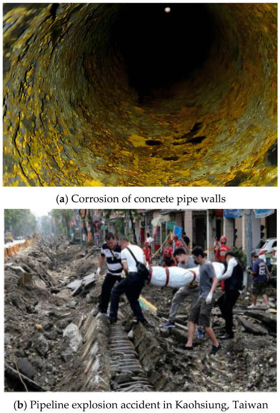 In recent years, corrosion in pipelines, as an important factor leading to pipeline failure, has been prevalent in the oil and gas, chemical, and urban rainwater and sewage treatment industries, seriously threatening the stable operation of pipeline networks. The frequent occurrence of accidents has caused huge economic losses, resource wastage, and even ecological pollution to the pipeline transportation industry [1,2]. Typical cases of pipeline corrosion-induced failure are illustrated in Figure 1, which visually demonstrates the severity and impact of such incidents. In the urban drainage pipeline system, all kinds of accidents caused by corrosion increase significantly with the growth of pipeline service time. Therefore, the accurate prediction and scientific assessment of pipeline corrosion rate to guide the preventive maintenance and optimization of pipeline management strategy is of far-reaching theoretical significance and an urgent practical need in order to enhance system efficiency, investigate pipeline safety hazards, and ensure stable operation of pipelines [3,4,5].