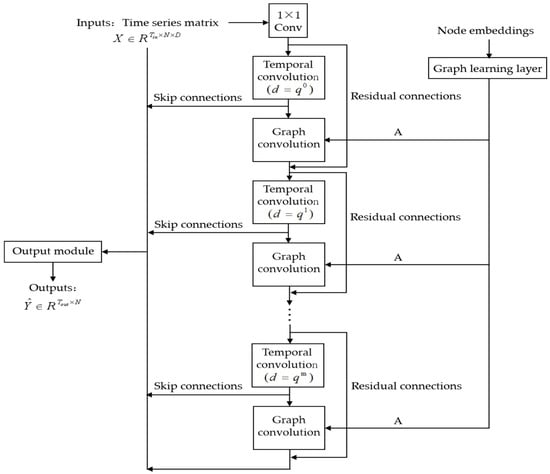 MTGNN can be targeted to solve the above multivariate time series prediction problem by dynamically and adaptively learning the temporal dependencies between nodes while optimizing the joint modeling of graphs and time series. MTGNN is mainly composed of three parts: graph learning layer, temporal convolution module, and graph convolution module, and its specific network structure is shown in Figure 2. The 1 × 1 convolution kernel first compresses the channel dimensions and maps the input features to the latent space. Then, the temporal convolution module and graph convolution module are stacked alternately to capture temporal and spatial correlations, respectively. The graph learning layer adaptively learns the hidden adjacency matrix between nodes. Residual connections and skip connections are introduced into the model to mitigate the gradient vanishing problem. The output module generates predictions by projecting the fused features to the target dimension.