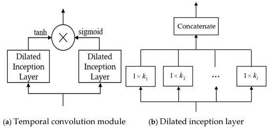 The temporal convolution module adopts a two-branch dilated inception layer structure, where each dilated inception layer contains multiple sets of one-dimensional dilated convolution kernels with different expansion rates to capture multi-scale temporal dynamic features. The two dilated inception layers are then nonlinearly transformed by accessing the tanh( ) activation function and the sigmoid( ) activation function, respectively. The dilated inception layer performs multi-scale feature extraction on the temporal data using multiple sets of 1D convolution kernels with different receptive fields and then integrates the feature maps generated by each convolution kernel, which is calculated as in Equation (3).