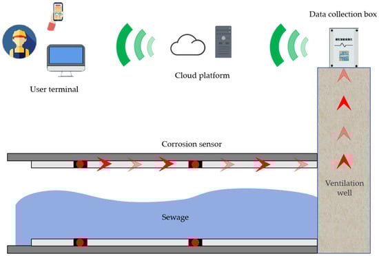 The data utilized in this research were obtained from an automated corrosion monitoring system implemented in a city’s concrete sewer pipelines. The data collection and transmission flowchart is shown in Figure 7. The monitoring equipment adopts a buried multi-probe corrosion sensor, which integrates the collector and multi-functional corrosion monitoring probe into one and can monitor multiple corrosion parameters in real time. The sensor cable is introduced into the special junction box reserved in the pipe section through the pre-embedded pipe and distributed along the longitudinal direction of the pipe section at multiple points. Due to the fluidity of the corrosive medium in the pipe, the closer monitoring points may collect the relevant results. This study selected a section with neighboring local monitoring points M1~M6 as an example of engineering data. The frequency of data collection is once every hour, and the collection period is from 21 July 2021 to 26 July 2024, with a total of 24,796 periods of data obtained.