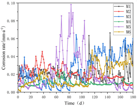 After the above preprocessing, the corrosion rate curves of the 6 corrosion monitoring points inside the pipeline in 6 months (to ensure visual clarity and to highlight the spatial differences between the monitoring points) are shown in Figure 8. As can be seen from Figure 8, the corrosion rates of different monitoring points have large differences, which reflects the influence of spatial location on the corrosion behavior. Therefore, consideration of the spatial characteristics of pipeline corrosion can help better mine the corrosion state information.