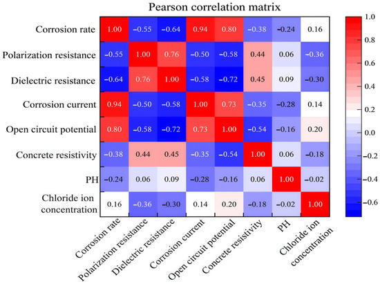 From the calculation results in Figure 9, it can be seen that there is an obvious positive correlation between corrosion current (0.94), open circuit potential (0.80), and corrosion rate, i.e., an increase in corrosion current and open circuit potential usually causes an increase in corrosion rate. There is a strong negative correlation between polarization resistance (−0.55), dielectric resistance (−0.64), concrete resistivity (−0.38), and corrosion rate, which suggests that an increase in resistance-based detection indicators contributes to the reduction of corrosion rate. Other indicators, such as PH (−0.24) and chloride concentration (0.16), had a weak correlation with corrosion rate.