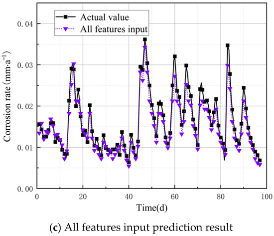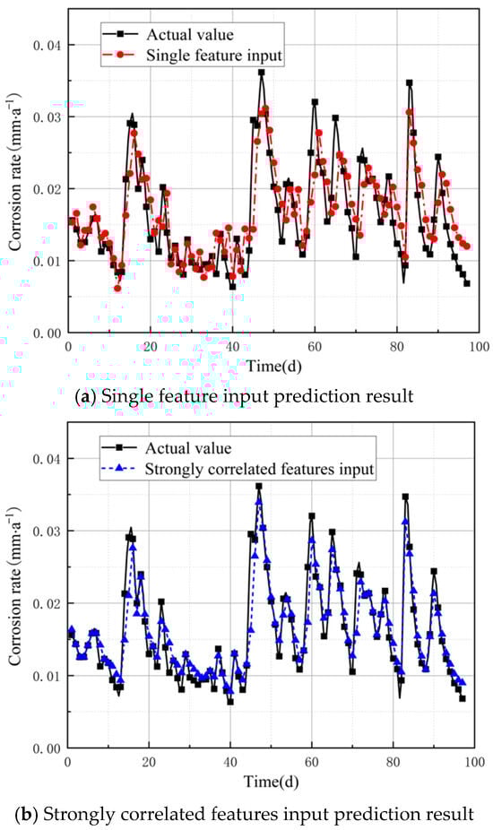 As shown in Figure 8, when the corrosion rate is relatively stable, the prediction results of the single feature input and the strongly correlated features input are not much different. When the corrosion rate fluctuates greatly, the strongly correlated features input performs better than the single feature input in capturing the peak of corrosion rate fluctuation, and it is more sensitive to the trend of data change. However, all features input will instead introduce redundant signals, making the information transfer between nodes less efficient and leading to a decrease in model prediction accuracy.