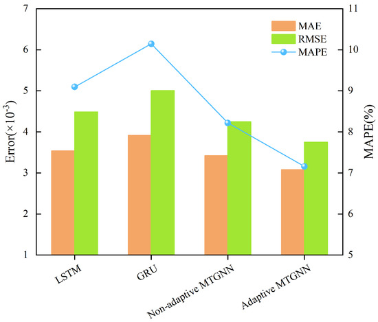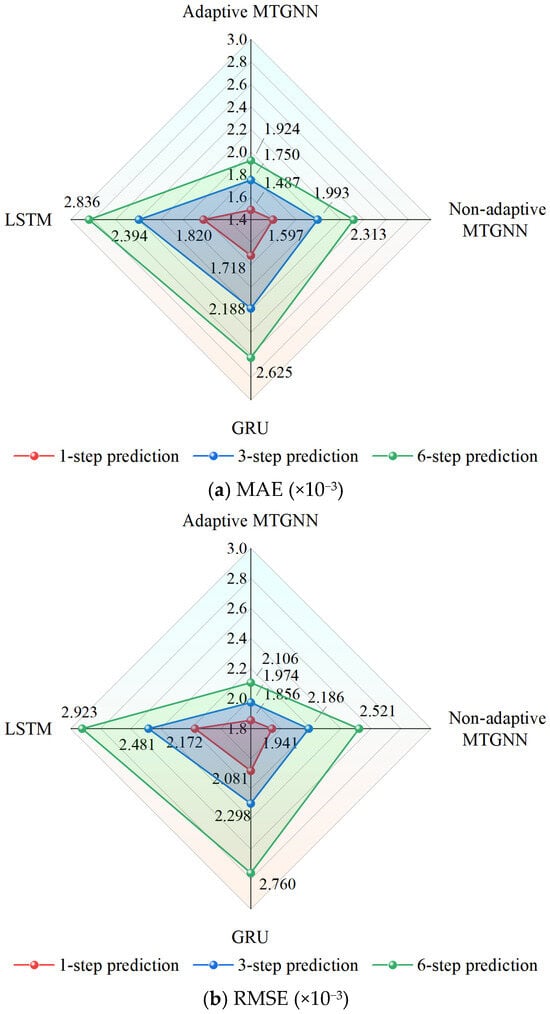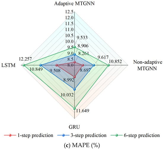 The results show that for 1-step prediction, the MAE of adaptive MTGNN decreases by 6.59%, 13.44%, and 18.30% compared with non-adaptive MTGNN, GRU, and LSTM, respectively. For 3-step prediction, the MAE decreases by 12.12%, 20.01%, and 26.90%, respectively. For 6-step prediction, the MAE decreases by 16.82%, 26.70%, and 32.16%, respectively. In addition, the improvement in RMSE error ranges from 4.38% to 27.95%, and in the MAPE error, it ranges from 5.01% to 22.22% over the prediction range of steps 1–6. It can be seen that the adaptive MTGNN significantly outperforms the other models on all three evaluation indices.