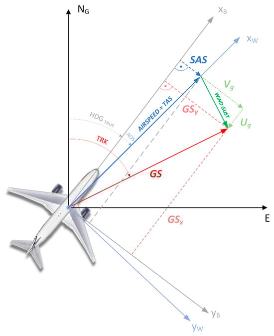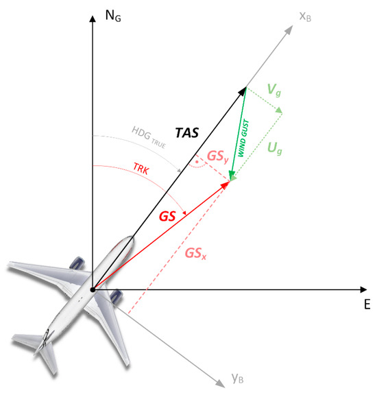 The wind gust velocity component along the airplane’s longitudinal axis (Ug) can be determined by calculating the vector difference between the measured TAS and the ground speed component GSx along the airplane’s x-axis (27). A positive value of Ug indicates a headwind, where the wind is blowing directly toward the nose of the aircraft (Figure 2).