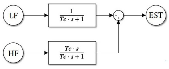 The measurement characteristics of GS and TAS, particularly their significant delays, impose strict limitations on the rapid and precise detection of gusts. While Equation (18) can estimate short-term variations in the headwind component, it cannot provide its absolute value. A practical solution to address this challenge is the implementation of a complementary filtering system. The complementary filter (CF) is a cost-effective and efficient data fusion technique that integrates a low-pass filter with a high-pass filter [37]. The general structure of the CF (Figure 3) incorporates low- and high-frequency inputs from the composite signal.