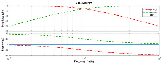 The transfer function of the complementary filter is expressed by Equation (29). Across the entire frequency spectrum, the linear CF maintains a unity amplitude (0 dB magnitude). Additionally, the phase shift remains linear and is equal to 0 degrees (Figure 4).