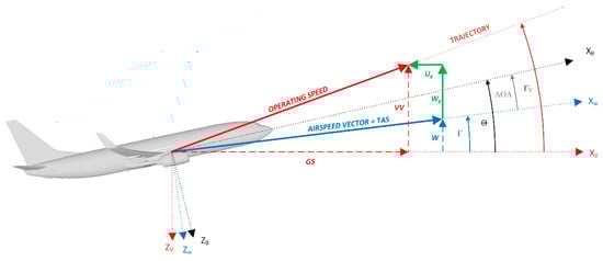 The X-Plane 11 Pro software employs a sophisticated nonlinear model to simulate aircraft dynamics [42]. This model utilizes blade element theory, which divide the aircraft into numerous small elements and calculates the aerodynamic forces acting on each element at frequencies ranging from several to dozens of hertz [43,44]. It accounts for complex environmental factors, including various wind phenomena, such as gusts. Wind parameters (direction, speed, and gust intensity) can be configured independently for each atmospheric layer via the instructor’s station module (shown on the right in Figure 8). During data recording, the wind output parameters are stored in the OpenGL coordinate system, which is Earth referenced (illustrated by the red arrows in Figure 10). For the purposes of this study, these parameters were converted into the aircraft’s body-fixed coordinate system. As a result, the Ug, Wg, and Vg wind components were determined (represented by blue arrows in Figure 10).