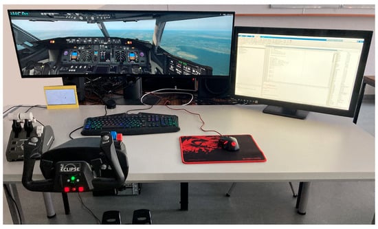 A simulator station (Figure 7) was used to evaluate the potential of estimating gust values using the algorithms described in Section 2. The external components of the simulator and their connection are presented on the block diagram (Figure 8). A professional and certified version of the X-Plane 11 Pro software was utilized, enabling enhanced use of the environment’s features for research purposes. The weather configuration tool within X-Plane allowed for the generation of wind layers from selected directions. It was possible to define both a constant wind speed and the intensity of gusts generated by the simulator environment. Experimental simulator flights were conducted using a realistic model of the widely used medium-range narrow-body aircraft the B737-800 (Figure 9). This advanced model accurately reflects the aircraft’s dynamic characteristics and operational behavior. A major advantage of the selected software is its ability to record all flight parameters required by the estimation methods under consideration. Table 1 presents a comprehensive overview of the recorded flight parameters, encompassing all potentially accessible physical data sources.