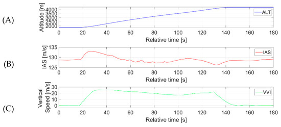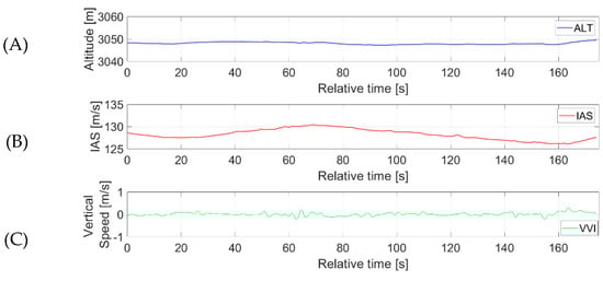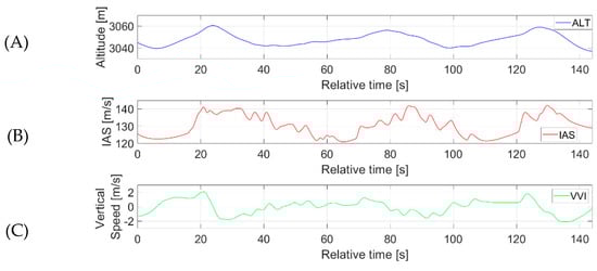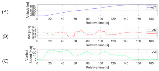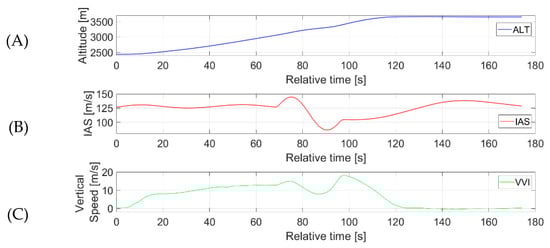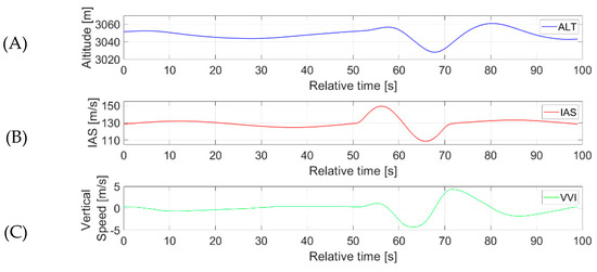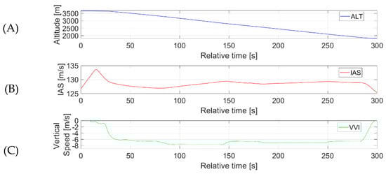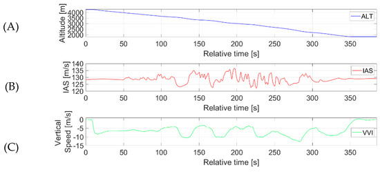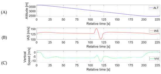 During the simulation, the aircraft descended from an altitude (ALT) of 14,000 ft (4267.2 m) to 6000 ft (1828.2 m). The flight was fully automated with the pilot operating the autopilot and autothrottle systems in LVL CHG and HDG SEL modes. A constant IAS 250 kt (128.6 m/s) was set on the MCP. Basic flight parameters are presented in Figure 11. Significant IAS fluctuations occurred between 50 s and 340 s of the recording (Figure 12B), caused by variable atmospheric gusts. These gusts also had a substantial impact on the aircraft’s vertical speed (VVI), which varied from a stabilized 6 m/s at the start of descent to values ranging between 3 and 12 m/s.