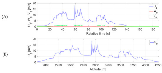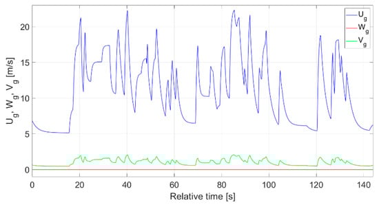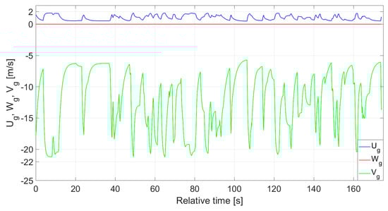 An advantage of estimating wind gust velocities using state equations is the ability to directly utilize measurement results obtained in the aircraft’s body-fixed coordinate system (FB). However, a drawback of this approach is the difficulty in estimating gust values in a three-dimensional framework (due to interdependencies in the algorithms) and its limitation to selected, identified flight states of the specific aircraft. These algorithms are also highly sensitive to the dynamic characteristics and errors of individual sensors [31,32], and the high-frequency signals ug-hi, vg-hi, and wg-hi, provided as high-pass input to the complementary filter, require corrections that are challenging to determine analytically [28]. For these reasons, estimating wind gusts in a 3D framework is very difficult and problematic to achieve using only state equations.