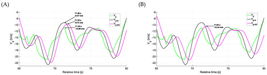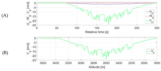 The vertical wind gust component along the aircraft’s vertical axis can be estimated based on the difference between the aircraft’s vertical velocity W, resulting from its flight path angle relative to the vertical motion of the air mass, and the vertical velocity VV (ground relative velocity measured by the variometer along the zV-axis; Figure 6). A positive Wg value indicates upward wind (opposite to the direction of the zV). Equation (39) defines the slowly varying (quasi-steady state) component of the vertical gust, assuming the simultaneous occurrence of a headwind gust.